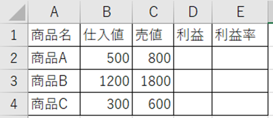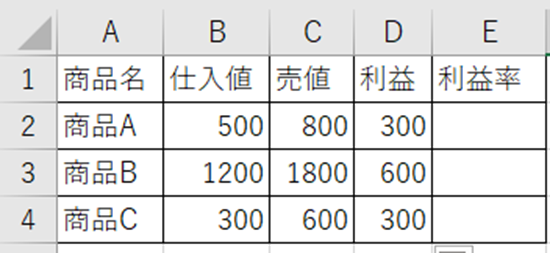 D列に利益、E列に利益率を表示したい場合、この方法を使います。