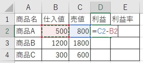 この数式は「売値(C2)から仕入値(B2)を引く」という意味です。