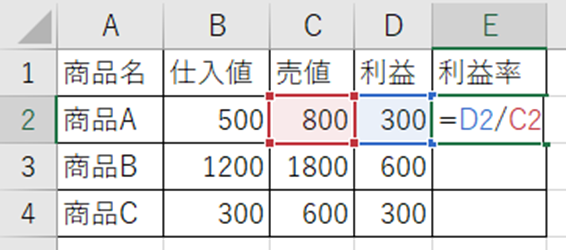 この数式は「利益(D2)を売値(C2)で割る」という意味です。