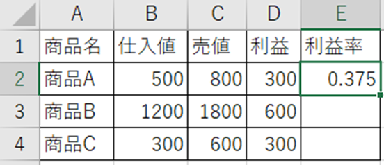 数式を下方向にコピーすれば、各行で利益率が計算されます。