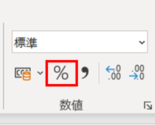 「ホーム」タブ→「パーセントスタイル」(%)をクリック