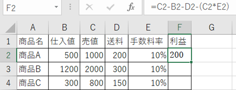 この数式は「売値-仕入値-送料-(売値×手数料率)」という意味です。