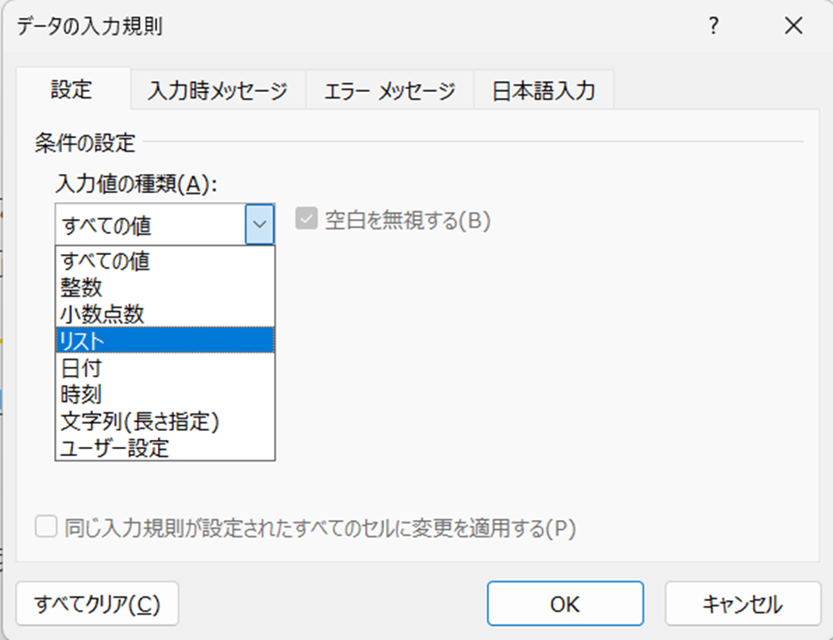 | 3 | 複数セルを一括解除 | 範囲選択→データの入力規則→「すべてクリア」 |