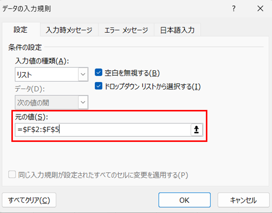 次にプルダウンを設定したいセル範囲を選択して「データ」→「データの入力規則」→「リスト」を選択します。「元の値」欄をクリックしてから、F2:F5のセル範囲をマウスでドラッグして選択します。セル範囲の参照式(例:=$F$2:$F$5)が自動的に入力されます。「OK」をクリックすると設定完了です。