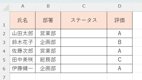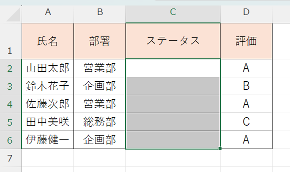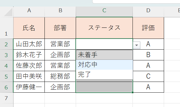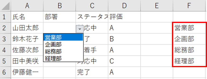 まずシートの任意の場所(別シートでも可)にリストの項目を縦一列に入力します。たとえばF2:F5に「営業部・企画部・総務部・経理部」と入力しておきます。
