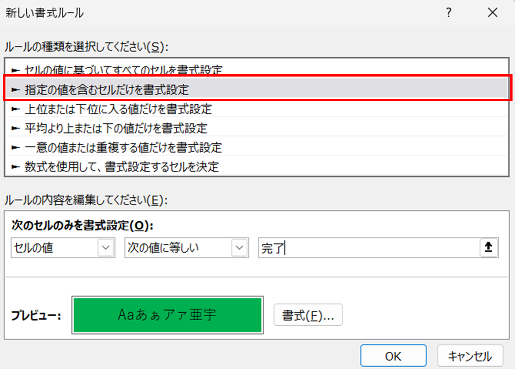 ルール1:セルの値 = “完了” → 背景色:緑(#99FF99)