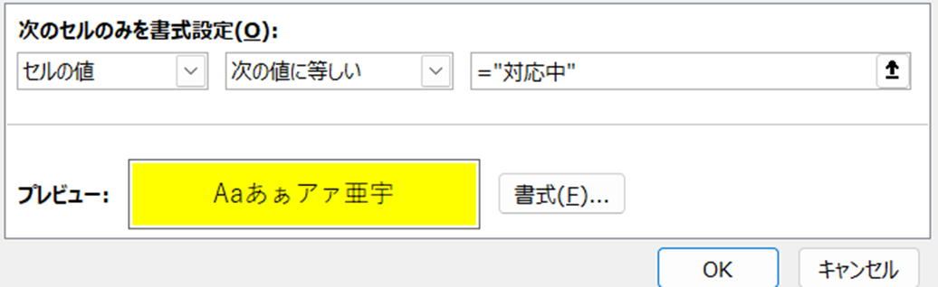 ルール2:セルの値 = “対応中” → 背景色:黄(#FFFF99)
