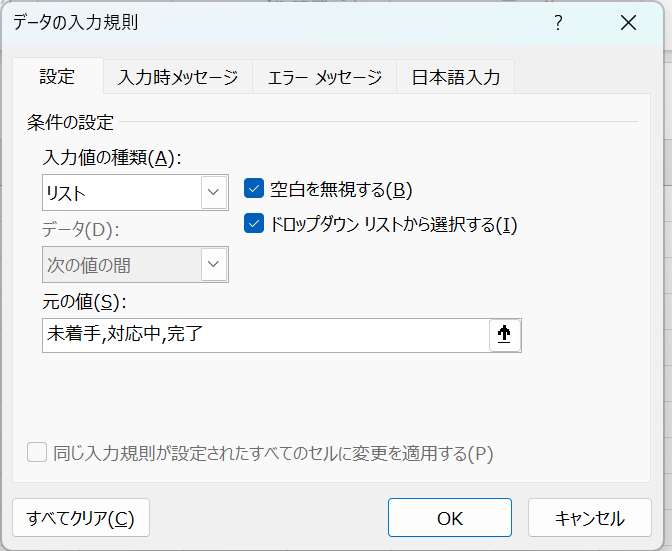 「元の値」欄に表示したい選択肢を半角カンマ(,)区切りで入力します。たとえばステータス列に「未着手、対応中、完了」の3つの選択肢を設けたい場合は以下のように入力します。