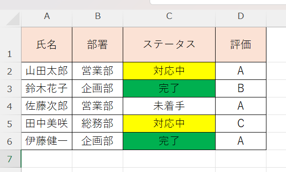 たとえばステータスが「完了」なら緑、「対応中」なら黄色、「未着手」なら白というように色分けすると、一覧表の状況が視覚的にわかりやすくなります。