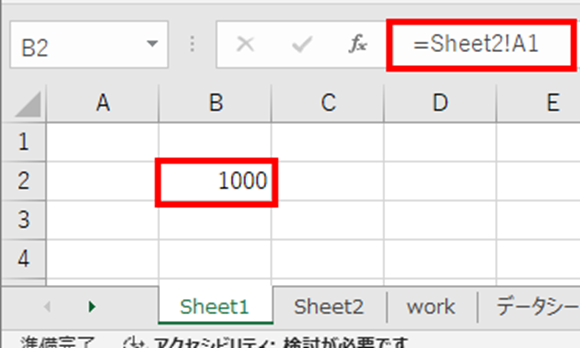 例えば、「Sheet2」のA1セルの値を「Sheet1」で参照したい場合、Sheet1のB2セルに以下のような数式を入力します。