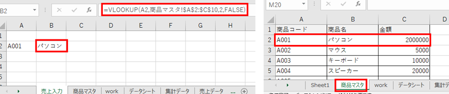 例えば、「商品マスタ」シートに商品コード、商品名、単価のデータがあり、「売上入力」シートで商品コードを入力したら自動的に商品名と単価が表示されるようにしたい場合、以下のような数式を使用します。