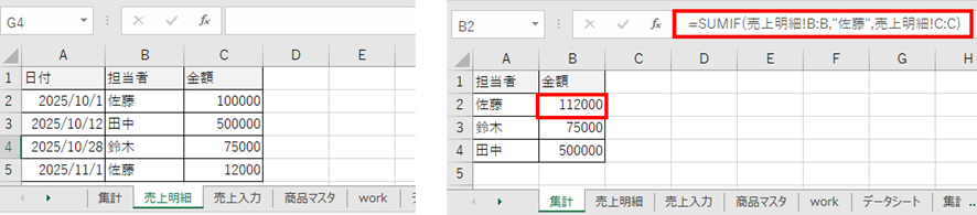 例えば、「売上明細」シートに日付、担当者、金額のデータがあり、「集計」シートで佐藤さんの売上合計を求める場合、以下のような数式を使用します。