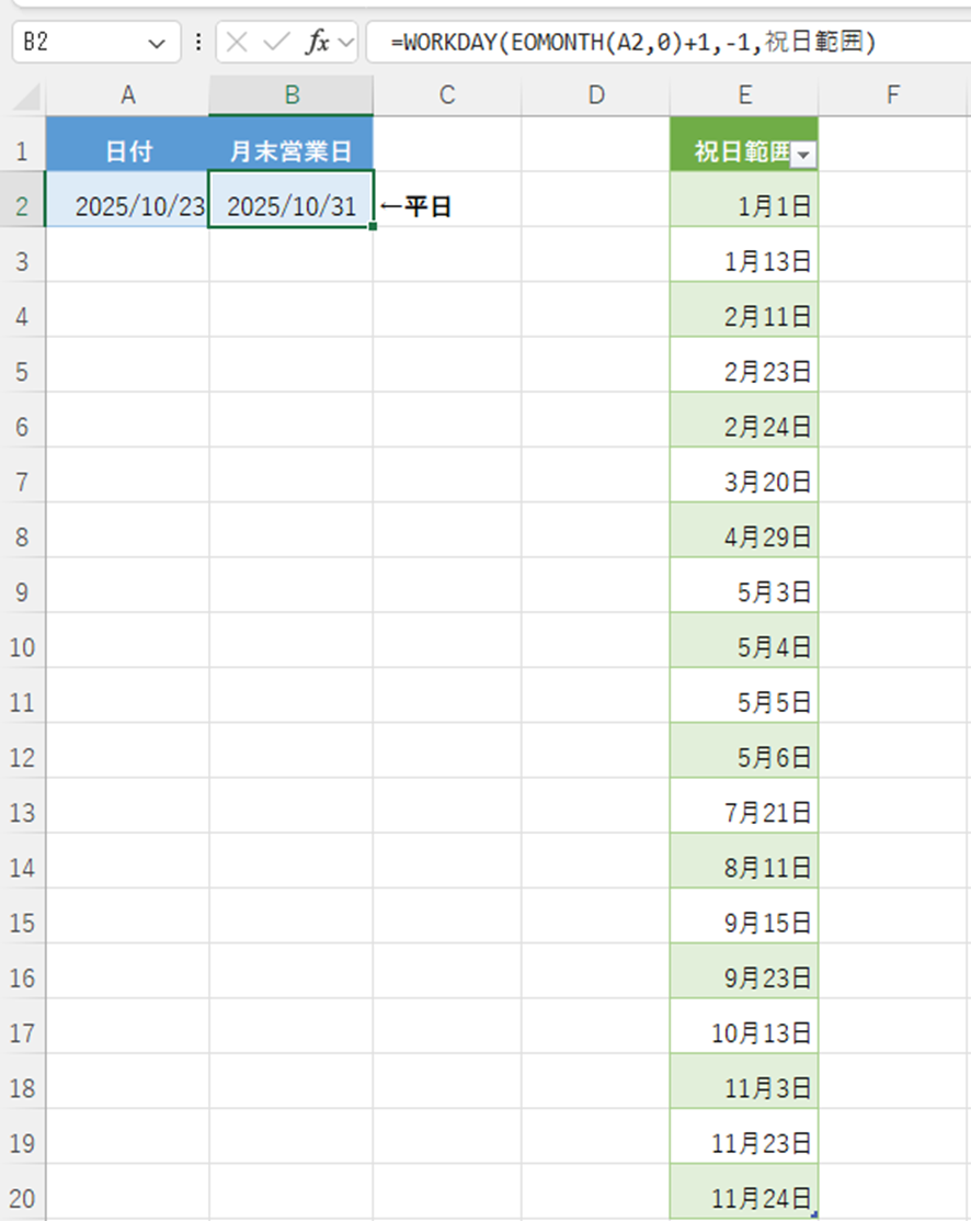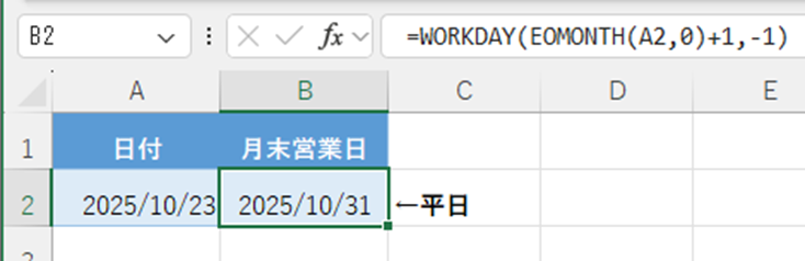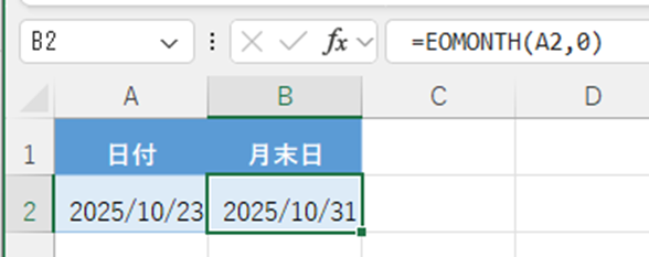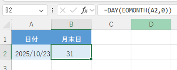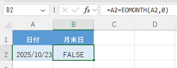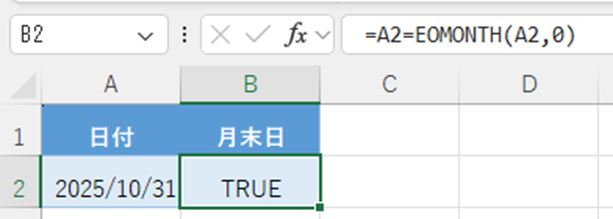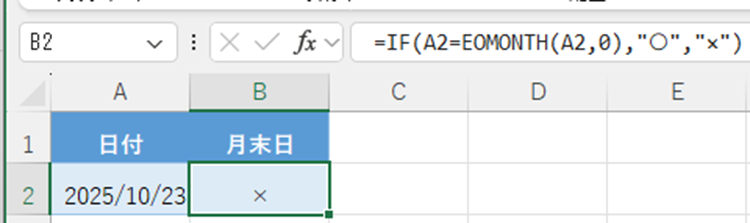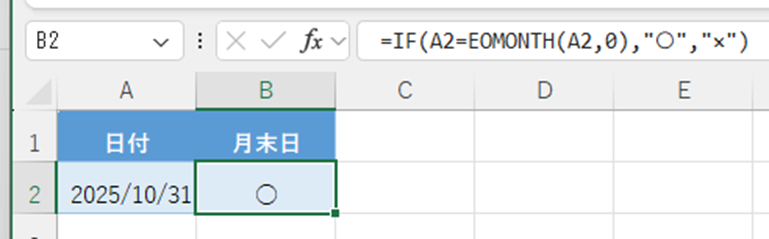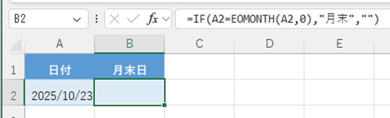 たとえば、A2セルが「2025/10/31」なら「月末」、「2025/10/23」なら空白が表示されます。