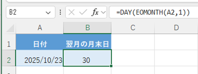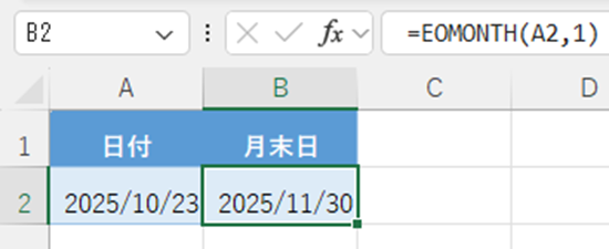 A2セルが「2025/10/23」なら、結果は「2025/11/30」となります。