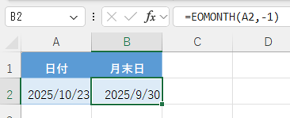 A2セルが「2025/10/23」なら、結果は「2025/9/30」となります。