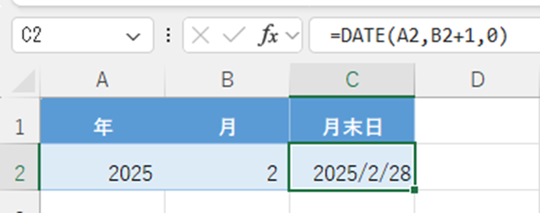 たとえば、A2セルに年(2025)、B2セルに月(2)が入力されているケースです。