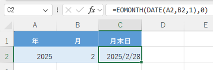 例えば、A2 が 2025、B2 が 2 の場合、結果は「2025/2/28」となります。