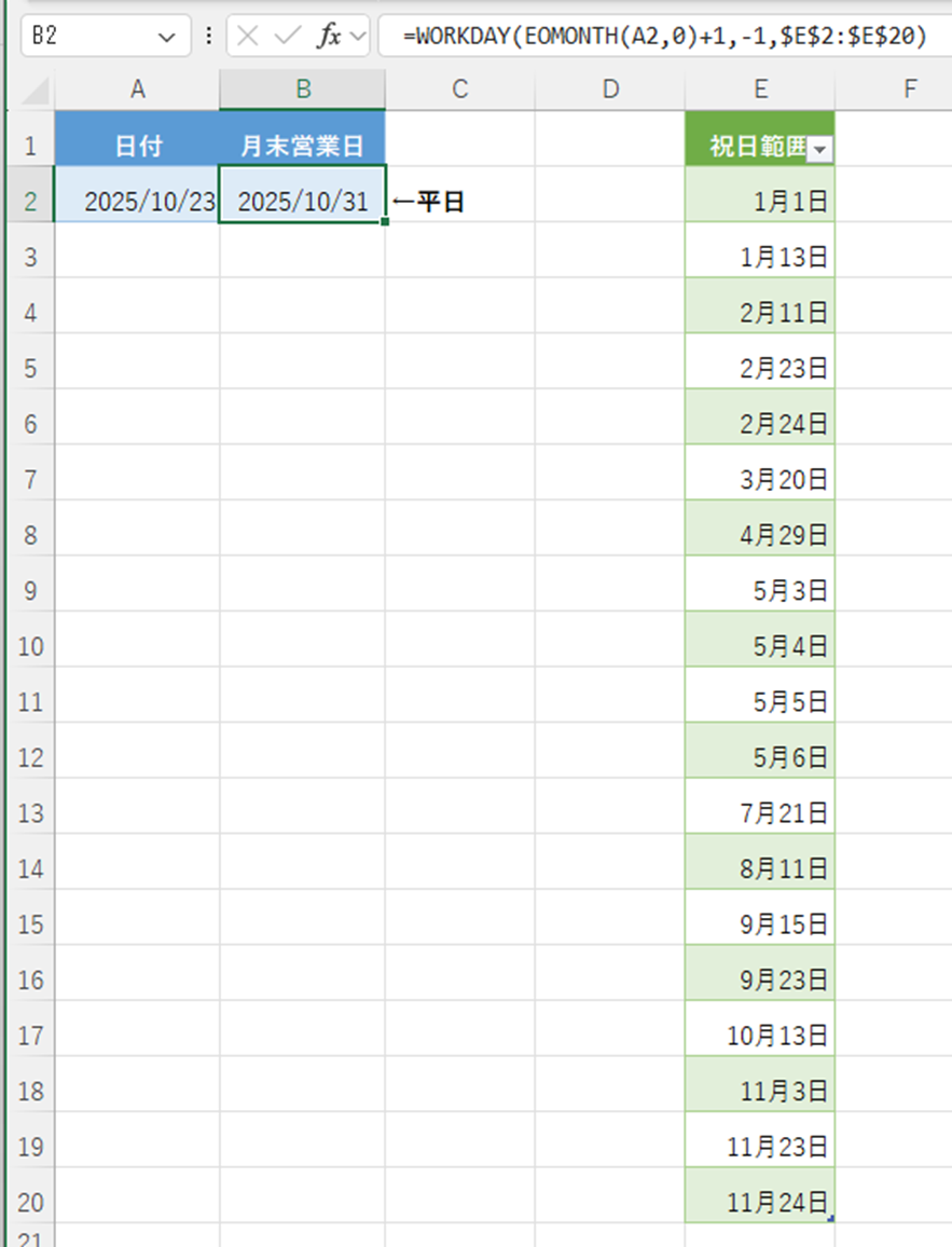 =WORKDAY(EOMONTH(A2,0)+1,-1,祝日範囲)