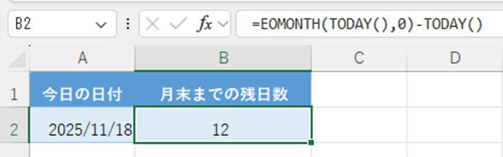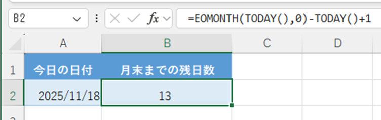 この場合は、EOMONTH関数とDAY関数を組み合わせる方法が便利です。