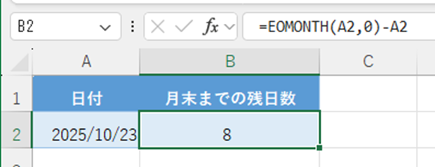 たとえば、A2セルが「2025/10/23」なら、結果は「31」となります。