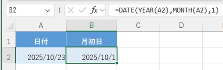この数式で、A2セルの日付が含まれる月の1日が表示されます。