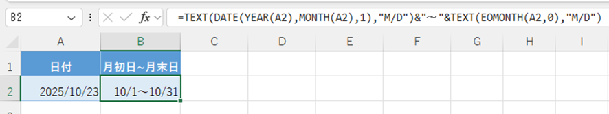 月初と月末を「10/1~10/31」のような形式で表示したい場合は、TEXT関数と&演算子を利用します。