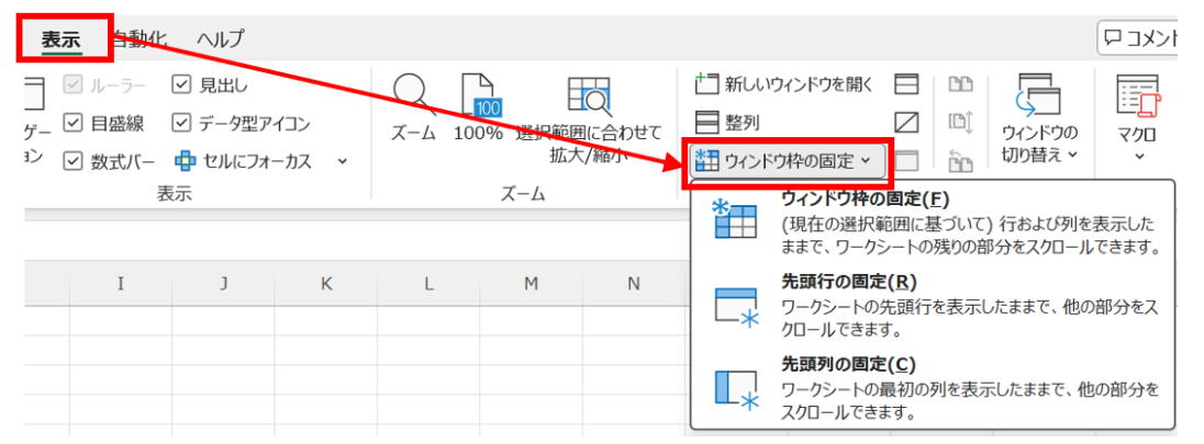 ウィンドウ枠の固定は「表示」タブから操作します。