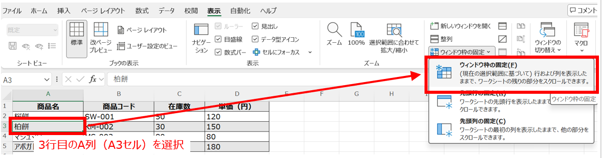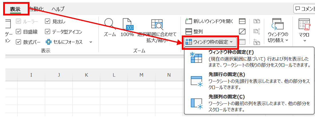 「表示」タブをクリックし、「ウィンドウ枠の固定」ボタンを選択するとドロップダウンメニューが表示されます。