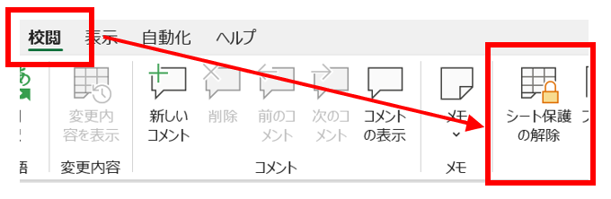 「校閲」タブ→「シート保護の解除」でシートの保護を解除してから操作しましょう。