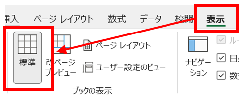「表示」タブ→「標準」をクリックして標準表示に戻してから、ウィンドウ枠の固定を設定しましょう。