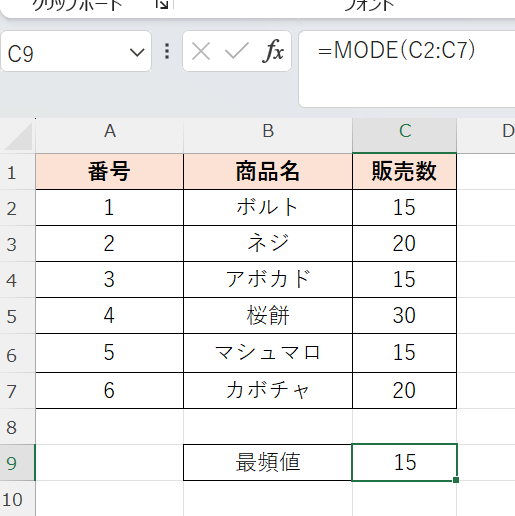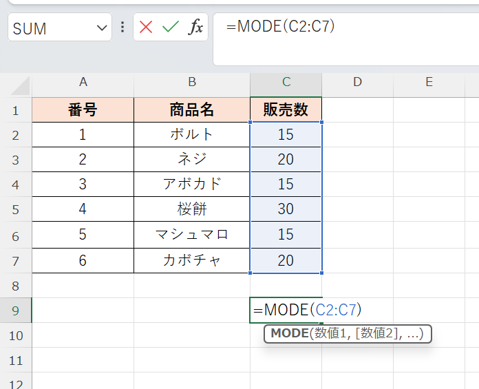 上記のデータでC列の販売数の最頻値を求めるには、任意のセルに以下の数式を入力します。