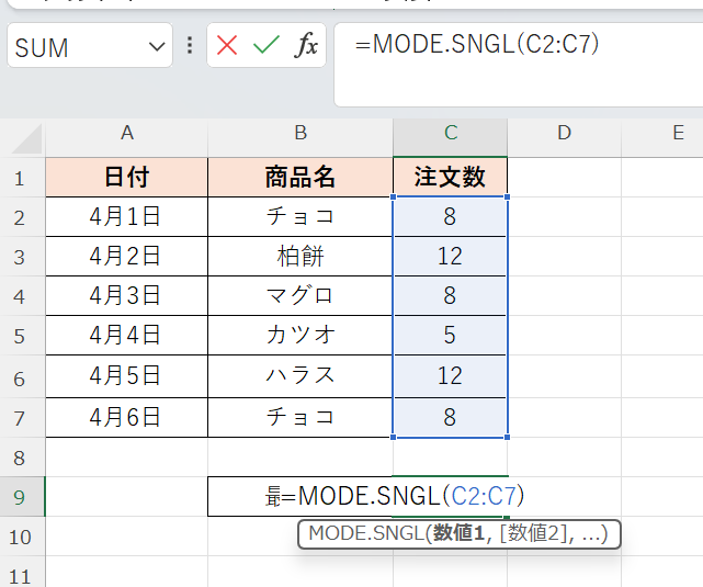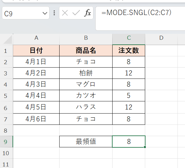 C列の注文数の最頻値をMODE.SNGL関数で求めるには以下の数式を入力します。