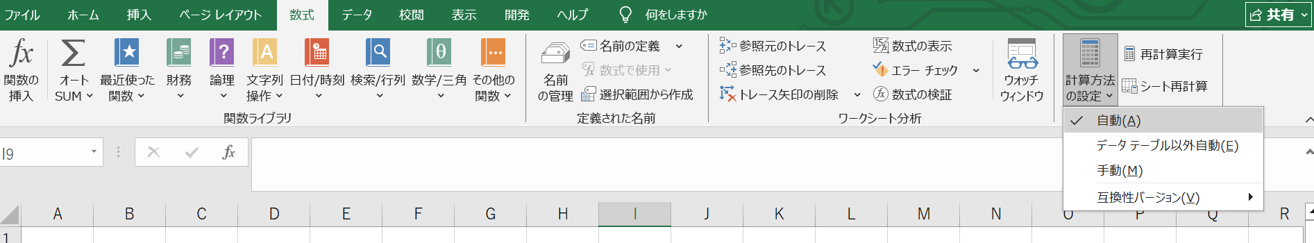 他の作業者が作成したファイルを引き継いだ場合、処理速度向上のために手動計算モードに設定されたままになっているケースがよくあります。