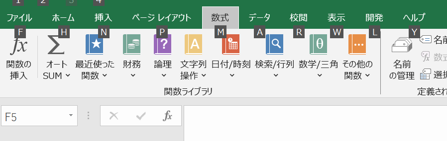 具体的には、Altキーを押してリボンのアクセスキーを表示させ、Mキーで「数式」タブを選択しましょう。