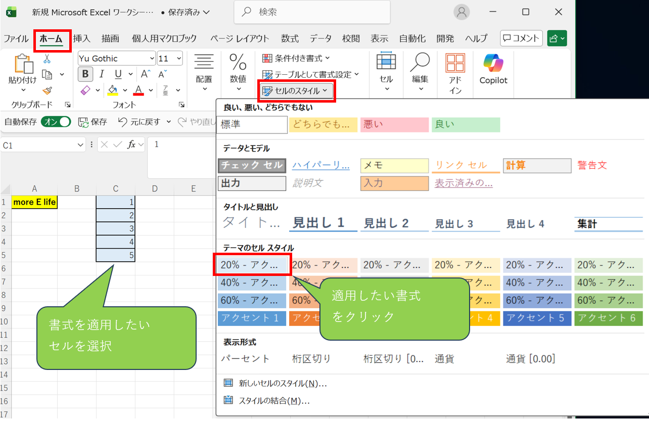 ホームタブ→セルのスタイルから書式テンプレートをワンクリックで適用。スタイルを変更するとすべての適用済みセルに自動反映。オリジナルスタイルの作成で独自の書式をテンプレート化できます。