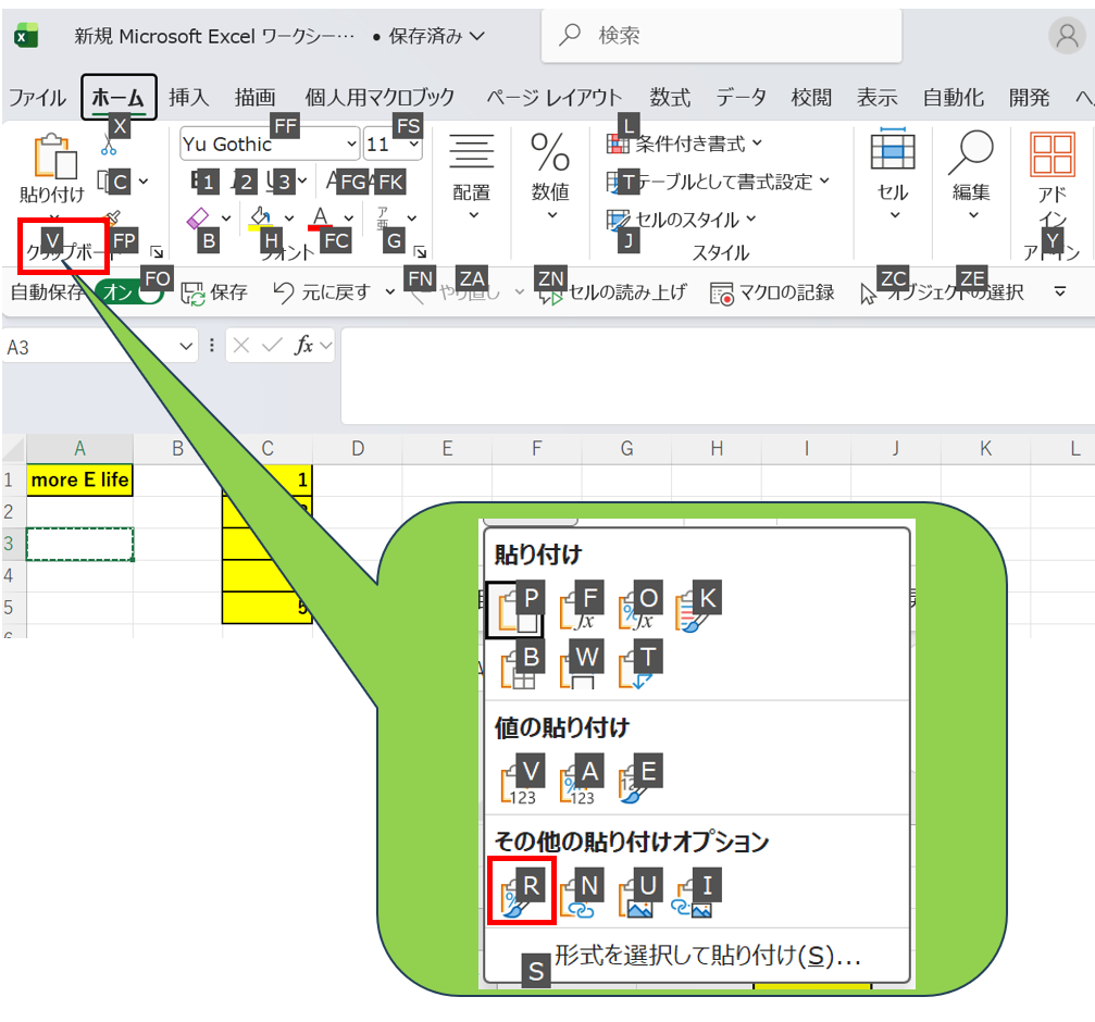 リボンキーナビゲーションを使う方法ではAlt→H→V→Rの順にキーを押すことで書式のみの貼り付けが実行されます。マウスを一切使わずにキーボードだけで書式のみのコピーができます。