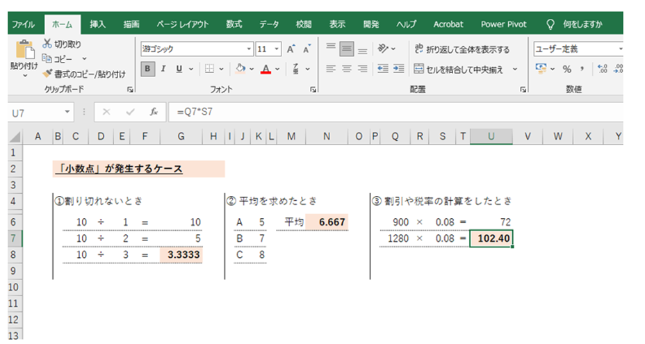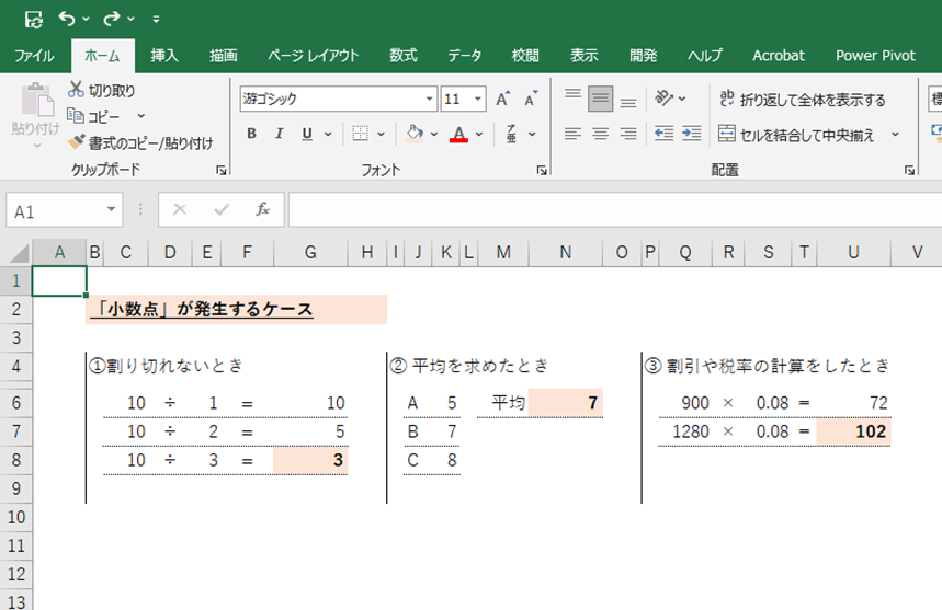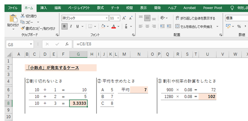 小数点が表示されないときは、計算そのものではなくセルの設定や表示方法が影響しています。