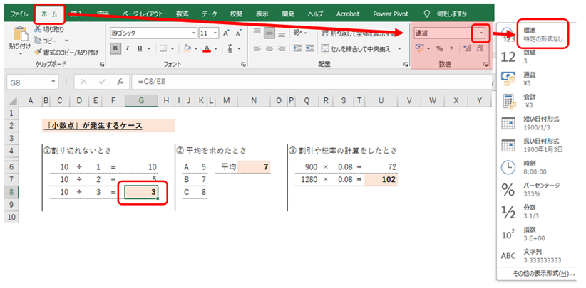 小数点を表示したいセルを選択後、画面上部の「ホーム」タブ→ 「数値」内の表示形式を「標準」に変更します。(小さな▼をクリックすると、「表示形式の一覧」が表示されます)