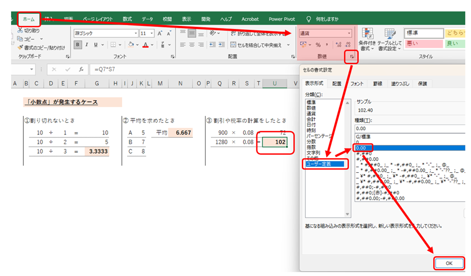 小数点が表示されないときの原因と解決法3【表示形式のユーザー定義を利用】