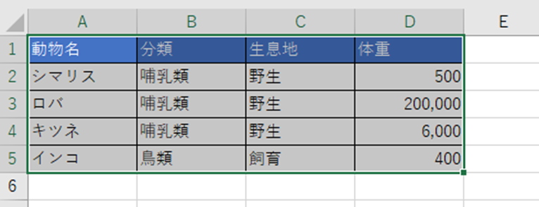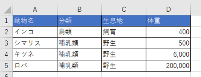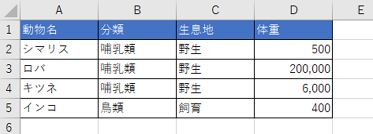 このデータを「分類」で並び替えたい場合、全体を選択することで、動物名、生息地、体重も連動して正しく並び替えられます。