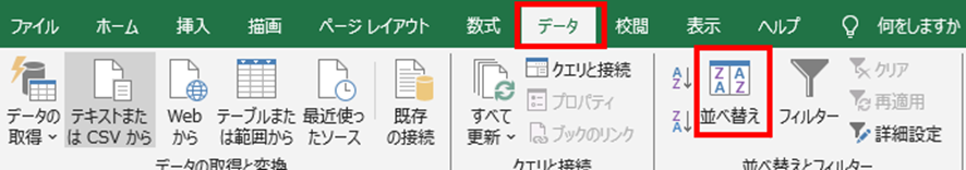 「データ」タブをクリックして、「並び替え」ボタンをクリックします。