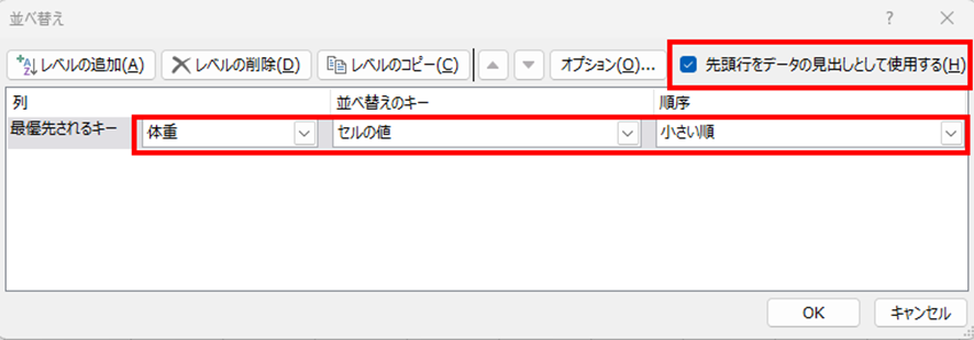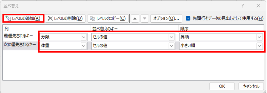 「次に優先されるキー」の「列」で「体重」を選択