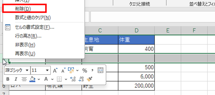 空白行を削除するには、該当する行番号を右クリックして「削除」を選択します。