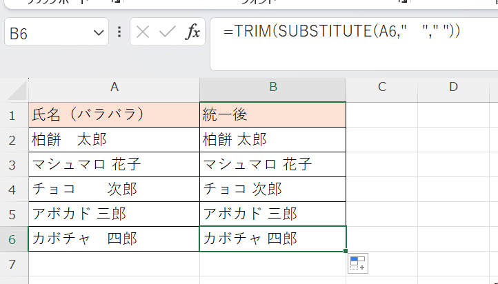 全角スペース1つに統一したい場合は、TRIM処理後に残った半角スペースをさらにSUBSTITUTEで全角に変換します。