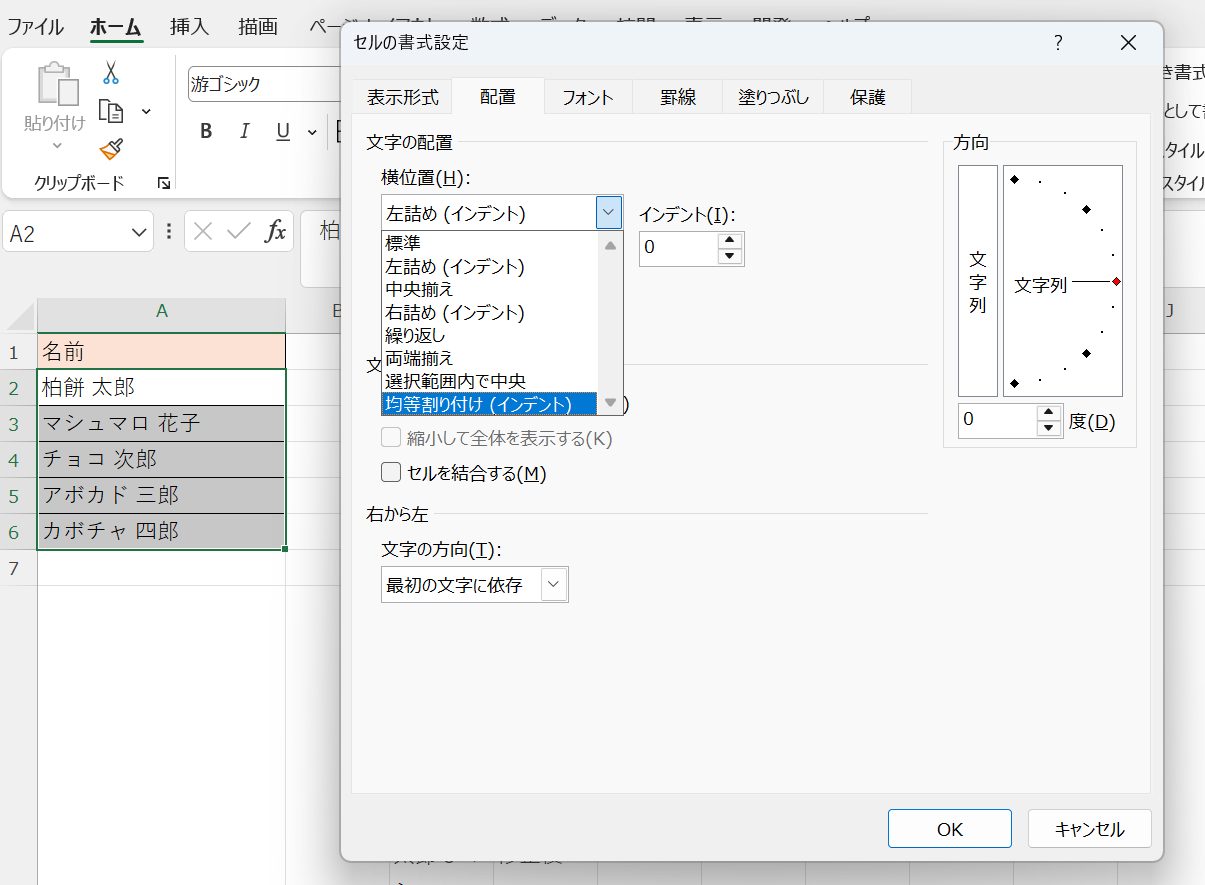 「配置」タブの「横位置」のドロップダウンから「均等割り付け(インデント)」を選択してOKをクリックします。
