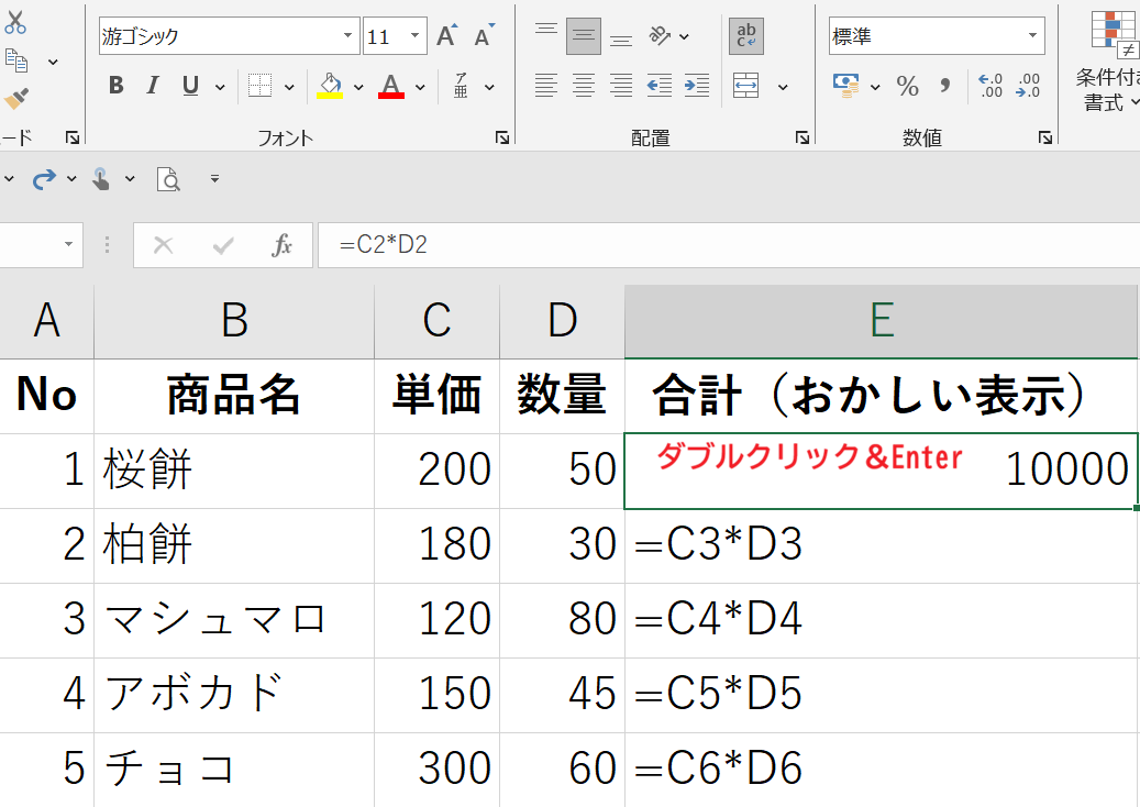 【操作のポイント】数式がそのまま表示される場合はセルの書式が「文字列」になっているか「数式の表示」がオンになっているかを確認します。書式を「標準」に変更後、セルをダブルクリック→Enterで再確定することで計算結果が表示されます。