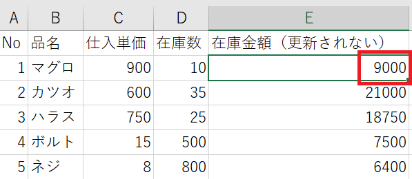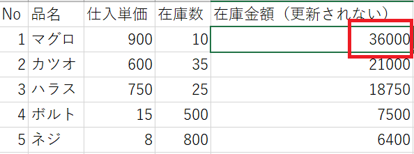 No 品名 仕入単価 在庫数 在庫金額(更新されない)