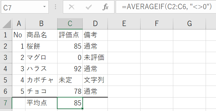 文字列が混在している範囲で数値のみの平均を求める場合も同様にAVERAGEIF関数が有効です。