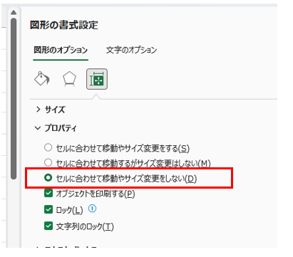 プロパティの項目が展開されたら、「セルに合わせて移動やサイズ変更をしない」のラジオボタンを選択するのが固定の肝です。