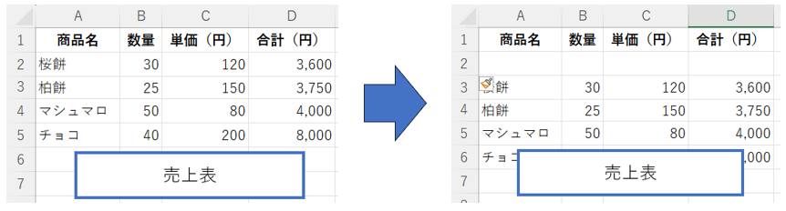 この表の上部に「売上まとめ」などのテキストボックスを置いている場合、行を追加するとテキストボックスが下にズレてしまいます。